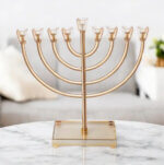 חנוכייה זהב מגיעה עם בסיס קריסטל שקוף 37 ס"מ