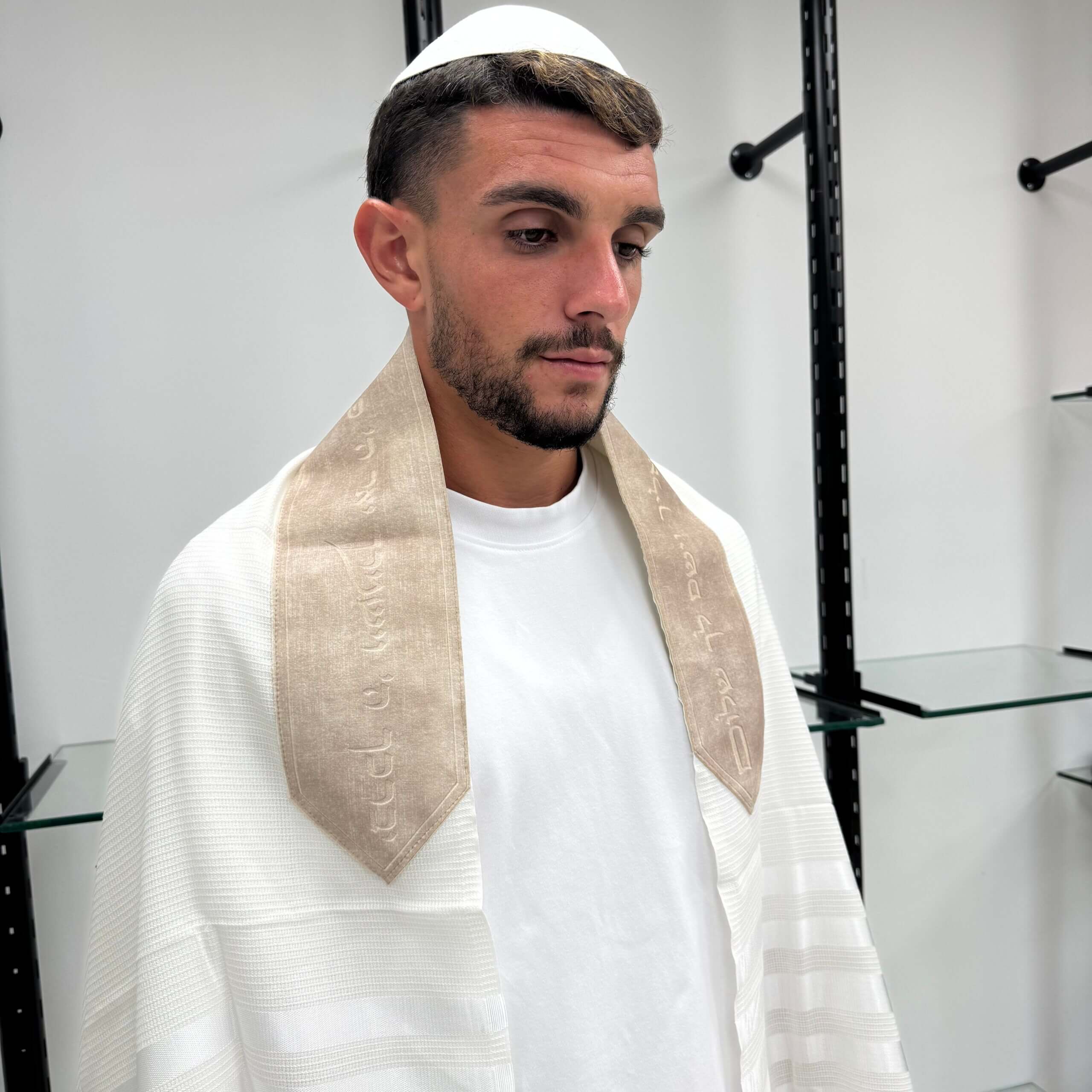 הוספנו לטלית עטרה מבד קטיפה משובח בחיתוך לייזר וריבועים בפינות בעיצוב ייחודי.