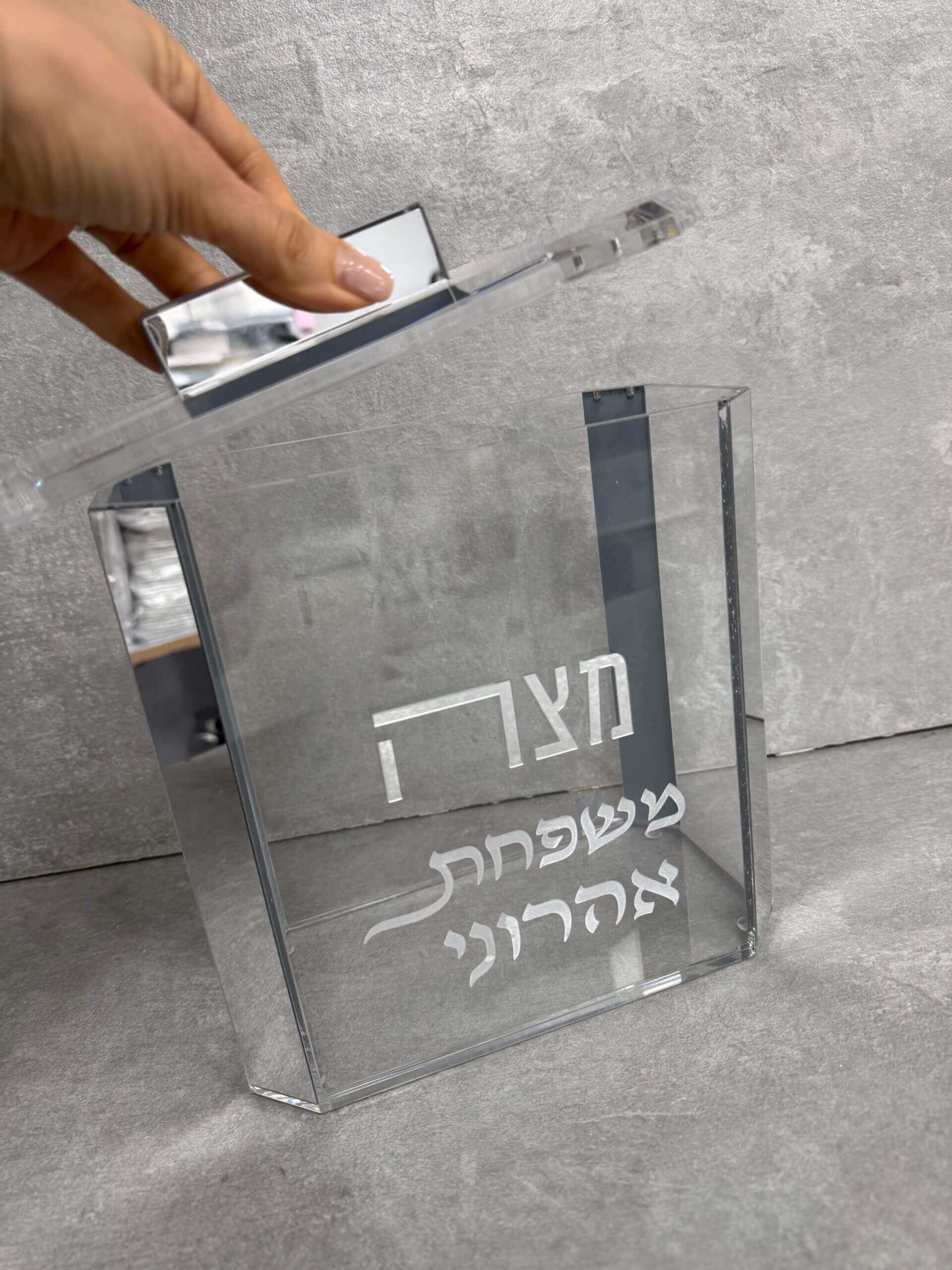 ניתן להוסיף בחריטת לייזר את שם המשפחה (על הקופסת מצות)