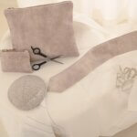 כיפה בד פשתן עם רקמת שם בצבע לבן.