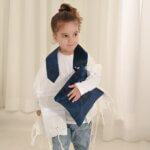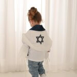 טלית ילדים מבד אקרילין עם תוספת עטרה מבד קטיפה משובח בצבע כחול עליה חריטה בלייזר- "יברכך".