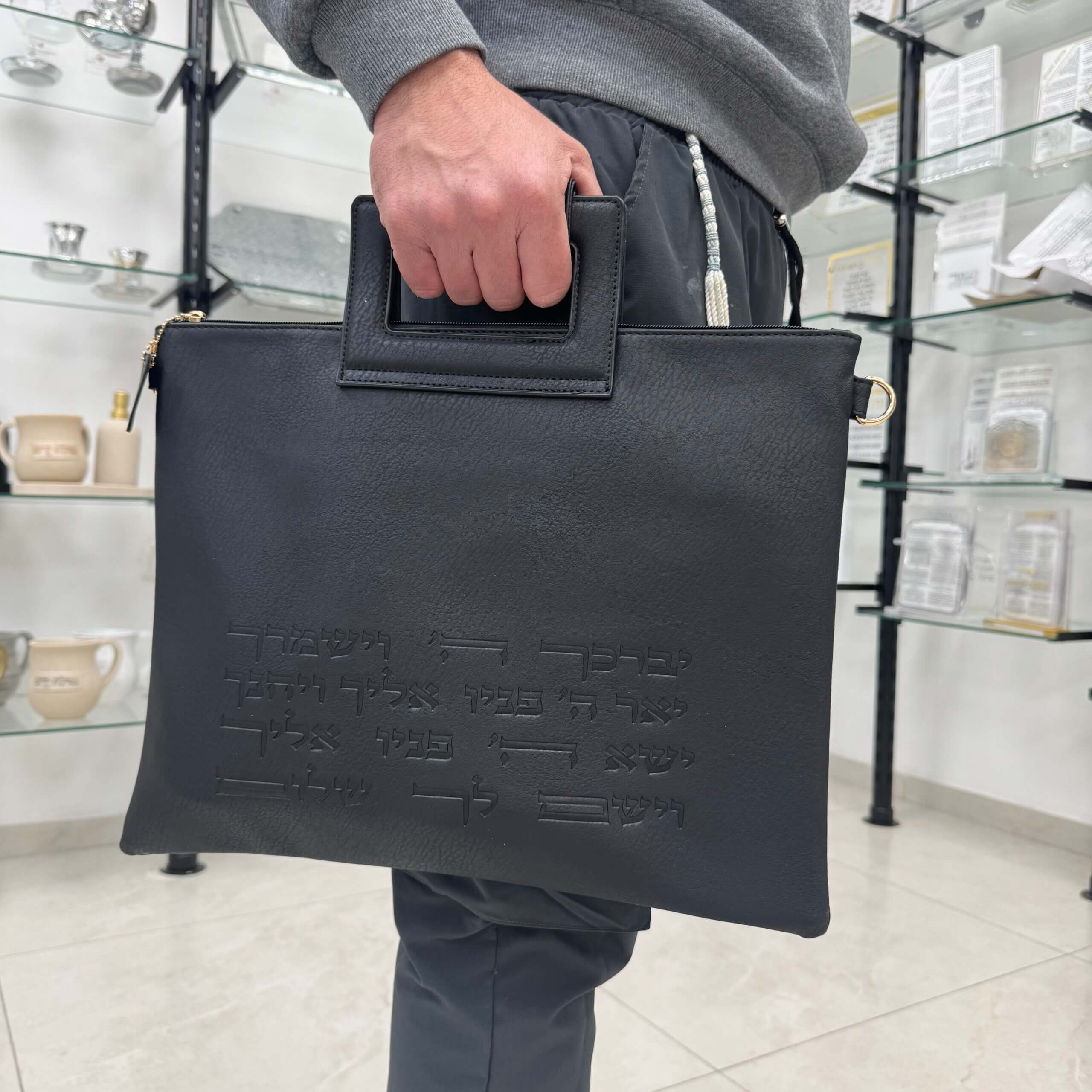 תיק הטלית מגיע עם ידית אחיזה ורצועה נוחה לנשיאה על הכתף.